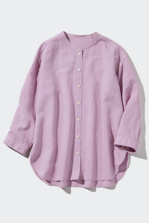Linen Blend Band Collar 3/4-Sleeve Shirt