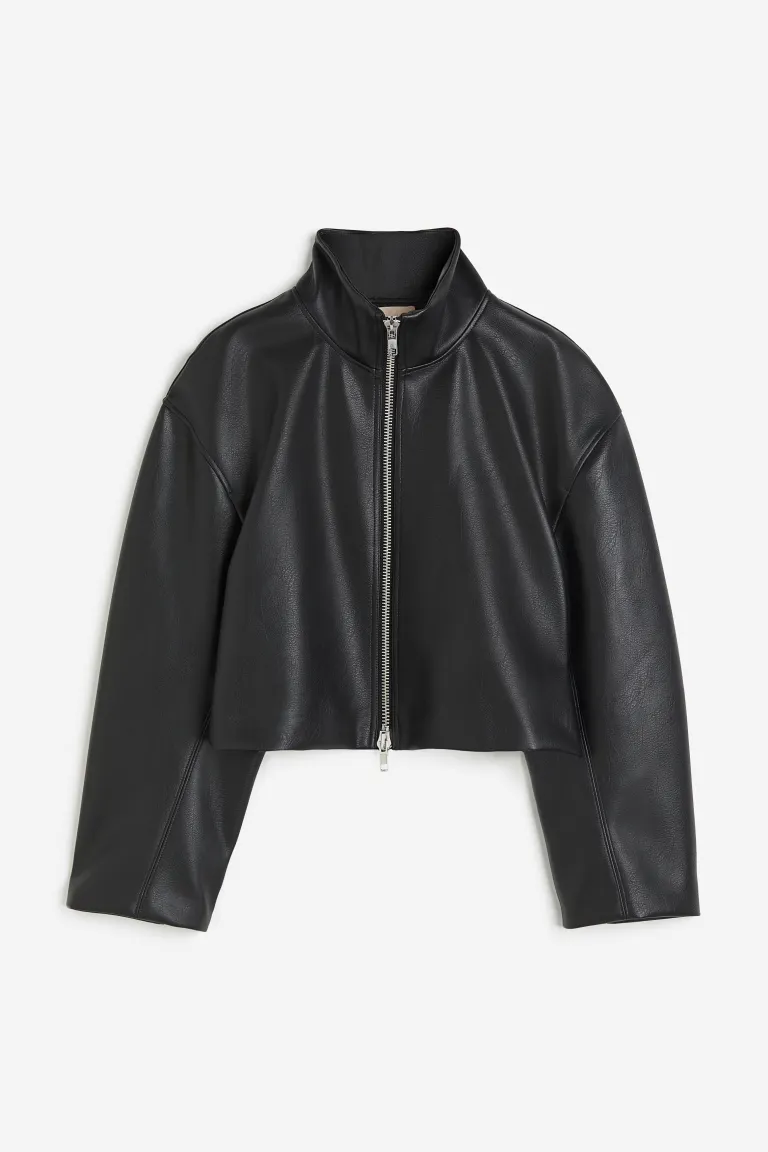 Oversized jacket in coated fabric with a stand-up collar, two-way zip down the front, dropped shoulders and long sleeves. Lined.