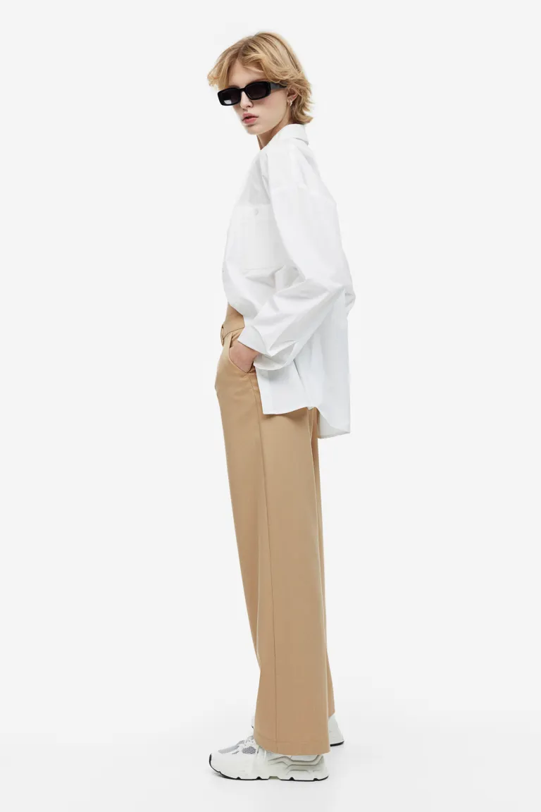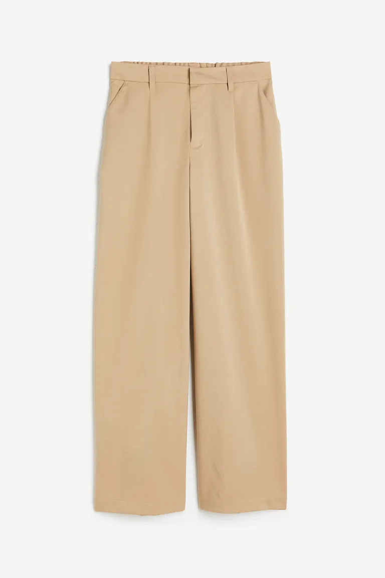②High waist with covered elastication at the back, a zip fly and button, diagonal side pockets and straight legs.
