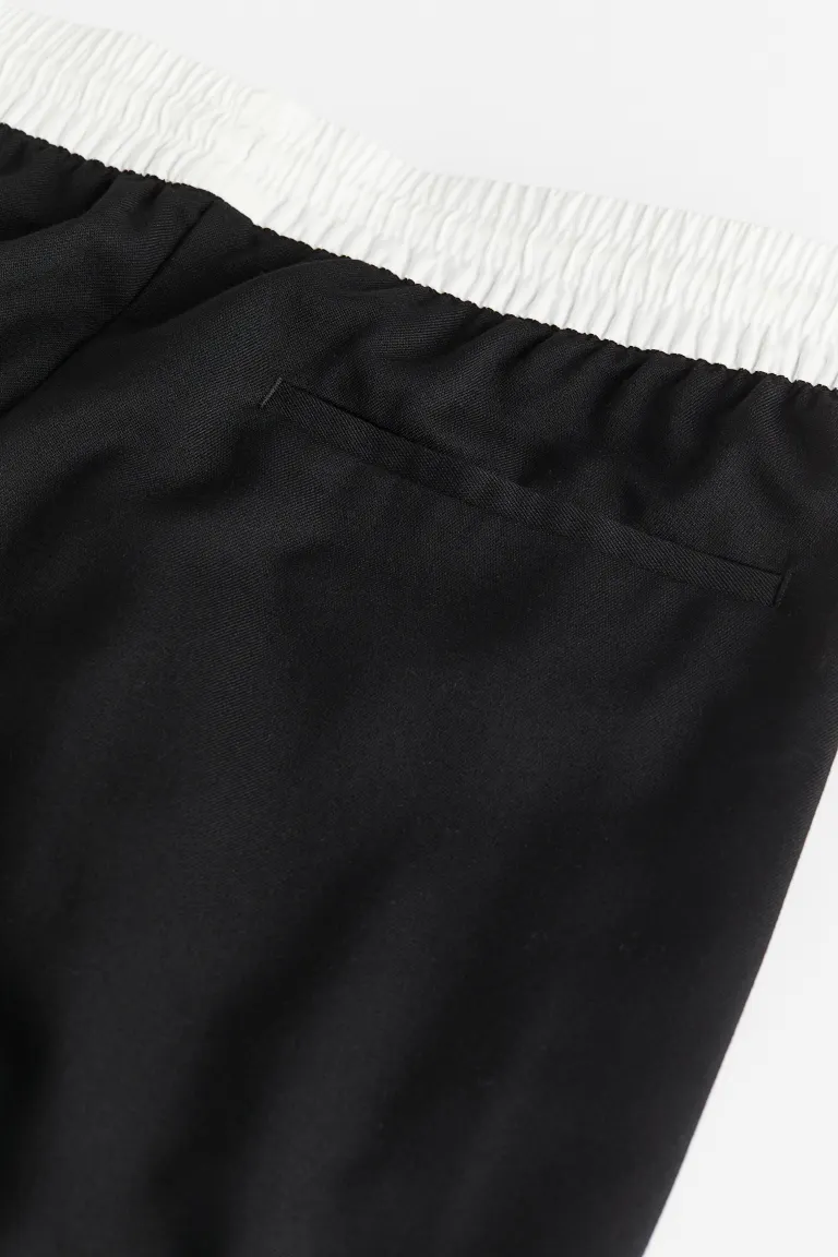①Trousers in woven fabric with elasticated smocking and a drawstring at the waist.